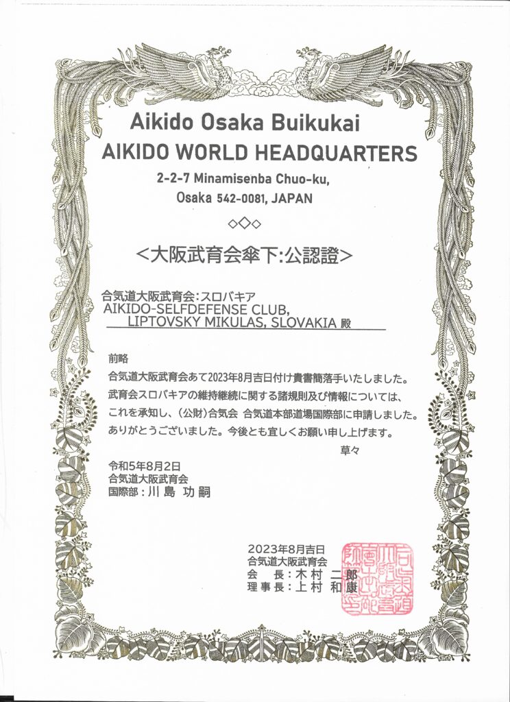 Klub Aikido Self-Defense Club Liptovský Mikuláš je oficiálne uznaný a registrovaný pod organizáciou Aikido Osaka Buikukai – Aikido World Headquarters v Osake, Japonsko.