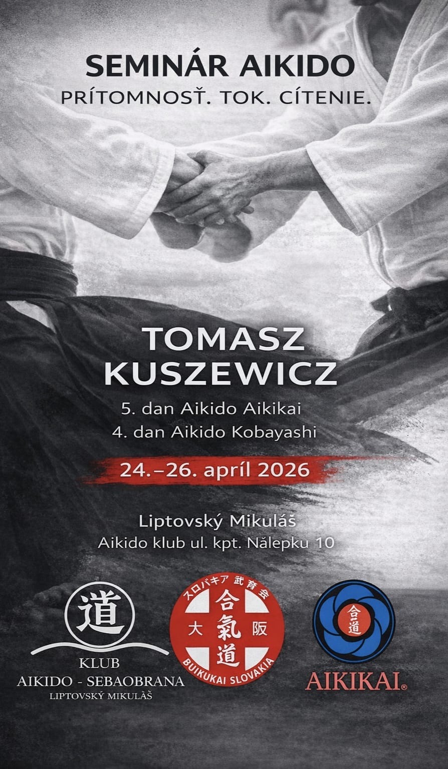 Pozývame Vás na seminár AIKIDO spojený so skúškami na kyu Tomasz Kuszewicz 5. dan – Buikukai Poland otvorený tréning, určené pre každého záujemcu, nezávisle na škole, alebo organizácii. Podrobnosti sú na letáku.